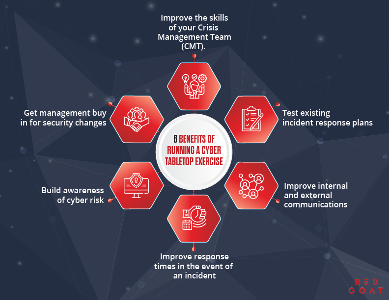 Essentially, a cyber tabletop exercise simulates a cyber attack to test organisational response and leadership decisions. It also checks if your crisis coordination will hold water in the event of a real-world cyber attack.